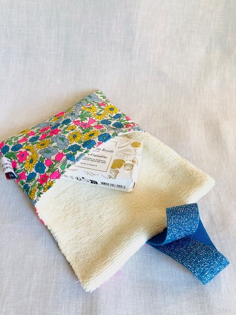 En viscose de bambou Oeko-tex recouverte de popeline de coton ou  Liberty, elle emmènera votre savon et votre shampoing solide partout avec vous.